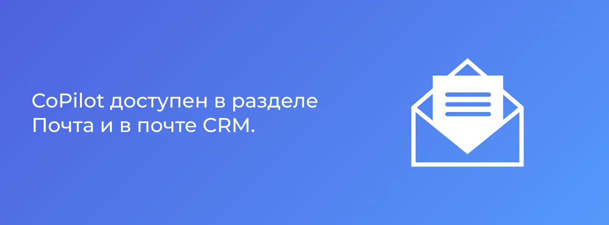 В почте Битрикс24 появился помощник с искусственным интеллектом — CoPilot. Он выделит главное из переписки, напишет новое письмо или продолжит уже начатый текст. CoPilot исправит ошибки в тексте и переведет его на другие языки.
