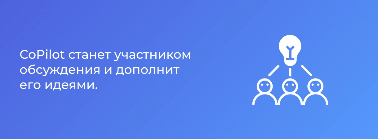 Представьте, вы работаете над проектом, который требует обсуждения с командой, будь то презентация продукта, рекламная кампания, корпоратив или подготовка отчета. Вместо множества писем, чатов или встреч, создайте чат с CoPilot и пригласите коллег.