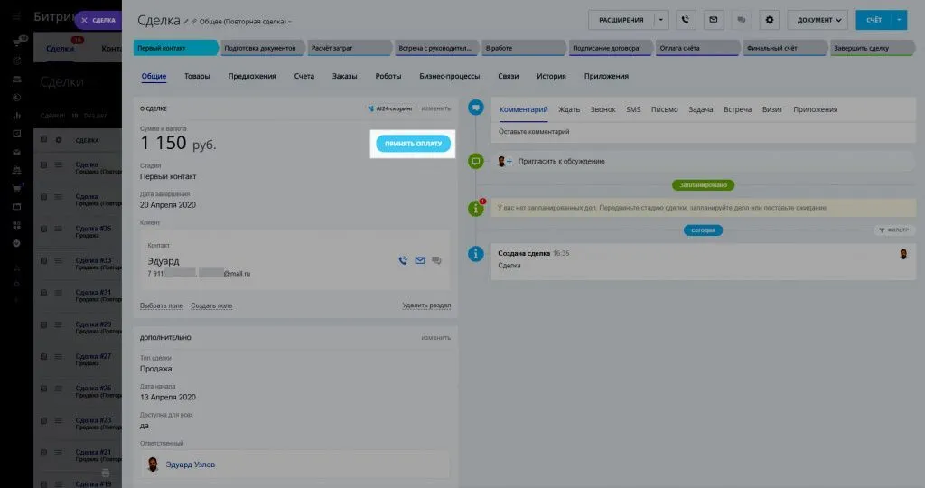Укажите или создайте товары и услуги. Если вы это сделали в карточке сделки, то они подтянутся автоматически.