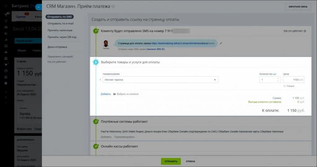 CRM-Магазин - новый формат онлайн продаж. Для этого не нужно даже создавать свой интернет-магазин. Вы просто отправляете вашему клиенту смс со ссылкой на страницу заказа, он переходит по ссылке и оплачивает товар любым удобным способом. Битрикс24 поможет быстро и просто организовать продажи в онлайн формате.