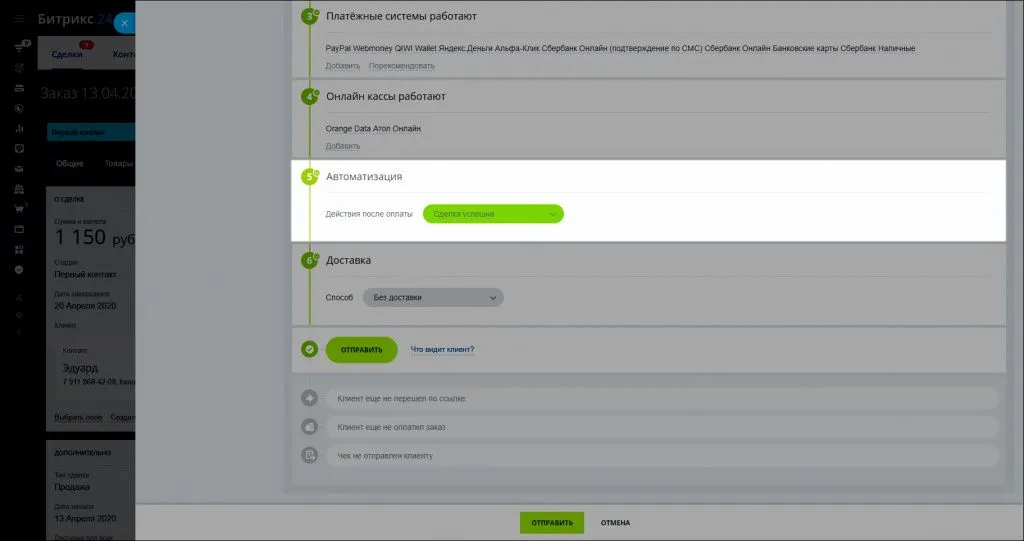 Выберите, на какую стадию переместить сделку после того, как заказ будет оплачен.