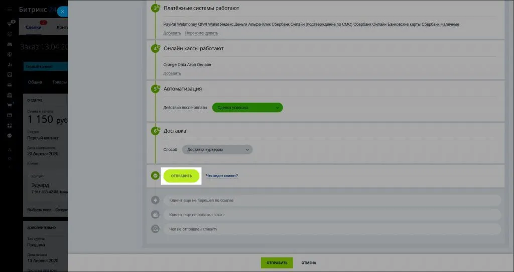 Сообщение со ссылкой на страницу заказа придёт на телефон клиенту в виде смс.