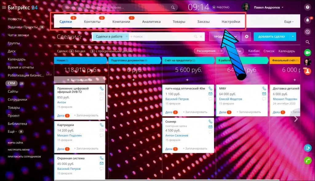 По умолчанию, CRM работает в простом режиме и не использует лиды. В верхнем меню вы увидите только необходимые разделы, остальные скрыты в пункте Ещё.