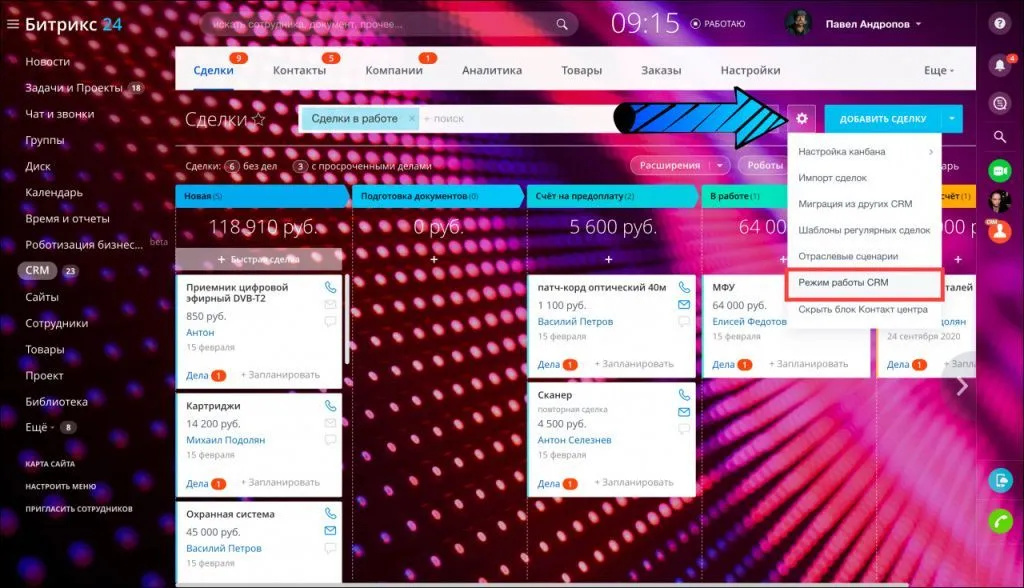 Вы можете изменить режим работы в разделе CRM - Сделки > нажмите на шестерёнку > выберите опцию Режим работы CRM.