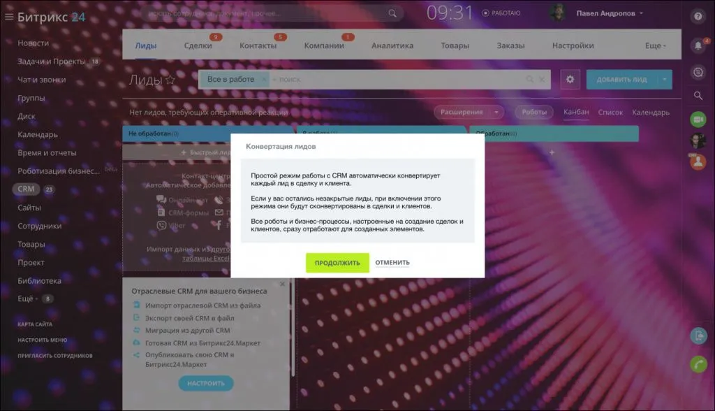Если вы работаете в режиме с лидами и хотите перейти на простой режим - Битрикс24 сконвертирует все незакрытые лиды в сделки и клиентов.