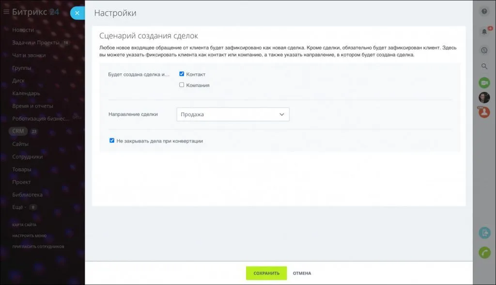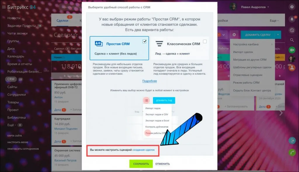 Выберите, как вы хотите работать со своей CRM. Здесь вы также можете настроить сценарий создания сделок.