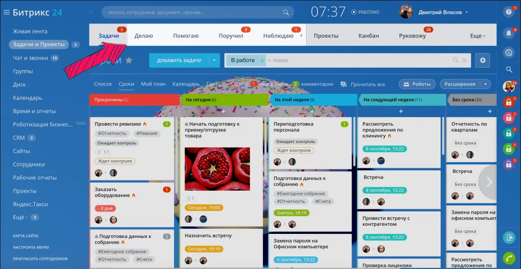 Откройте раздел Задачи и проекты, используйте панель навигации для фильтрации задач по ролям: Делаю, Помогаю, Поручил, Наблюдаю.