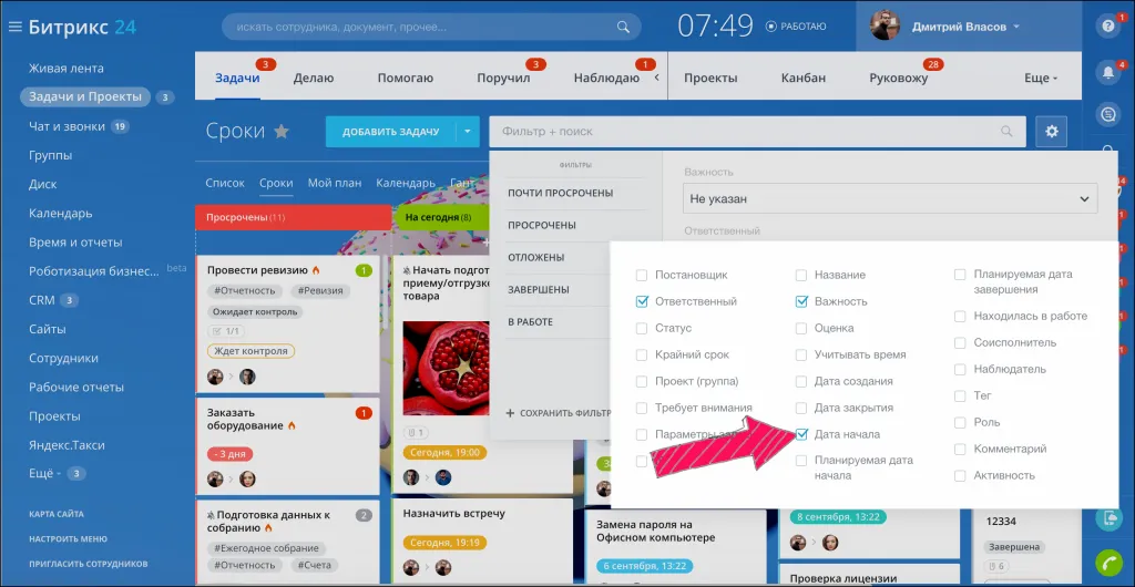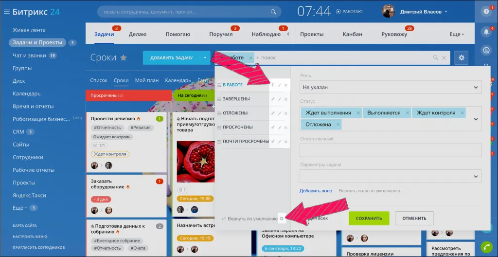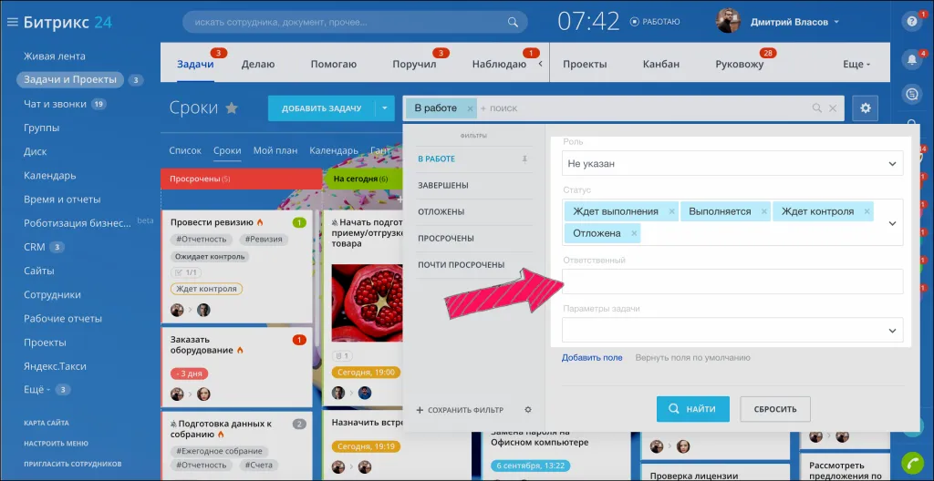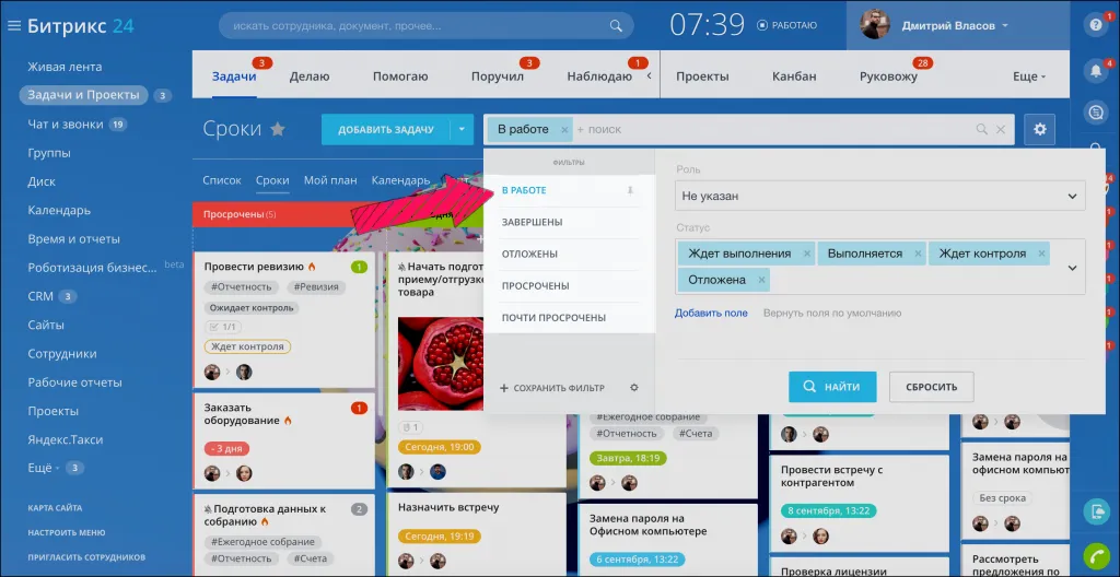 Сортируйте задачи по вашему усмотрению. Нажмите на поле и выберите готовые фильтры для поиска: в работе, завершены, отложены, просрочены или почти просрочены.