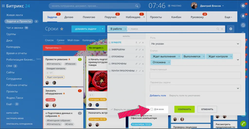 Администратор портала может сохранить созданный фильтр у всех сотрудников. Для этого нужно поставить галочку в поле Для всех.