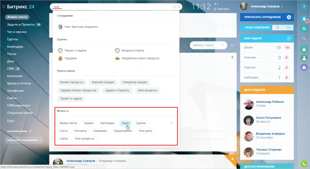 Далее уже с помощью фильтра вы сможете найти нужную вам информацию в любом разделе Битрикс24 – в Живой ленте, в Задачах, в Календаре, в CRM, в Бизнес-процессах и т.д.