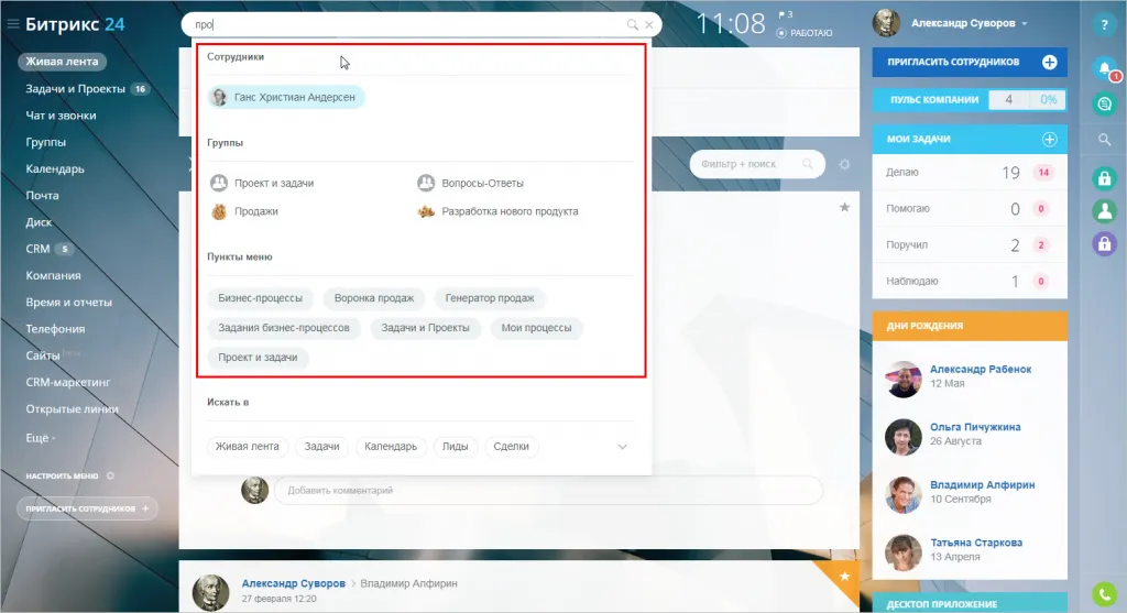 В главном поиске выводятся быстрые результаты из 6 категорий – Сотрудники, Группы, разделы и пункты меню портала, Задачи, элементы CRM (лиды, сделки, контакты, компании) и файлы Диска: