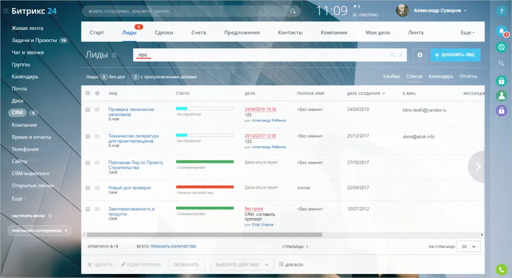 Аналогичным образом можно сразу перейти в нужный раздел Битрикс24, настроить фильтр по нужным полям и найти необходимую информацию.