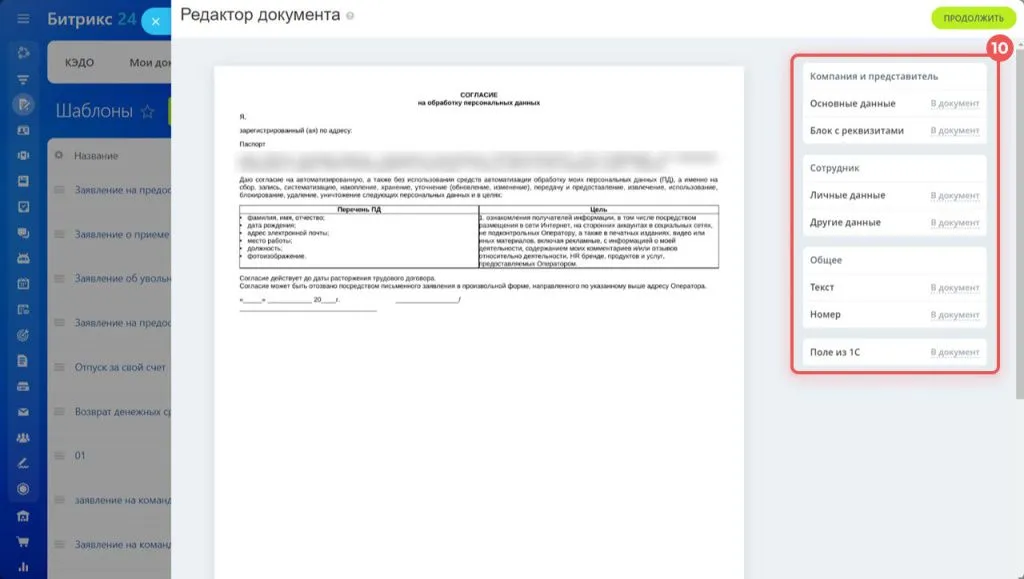 В Битрикс24 КЭДО появилась возможность создавать шаблоны документов. С их помощью можно автоматически сформировать и отправить документы на подпись сотрудникам. Например, подготовить шаблон согласия на обработку персональных данных и автоматически отправить его новым сотрудникам.