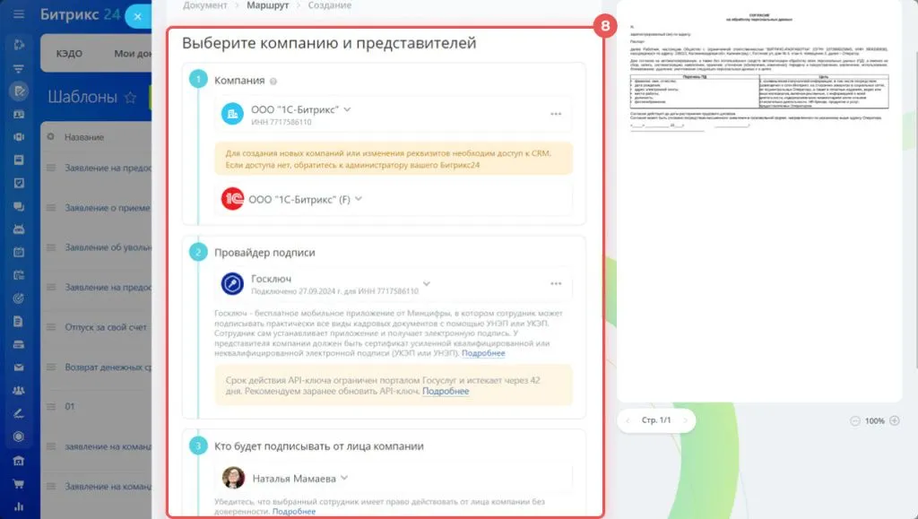 10. Выберите, какие данные добавить в документ: о компании, представителе или сотрудниках. Если у вас настроена синхронизация Битрикс24 КЭДО + 1С, можно добавить данные из 1С.