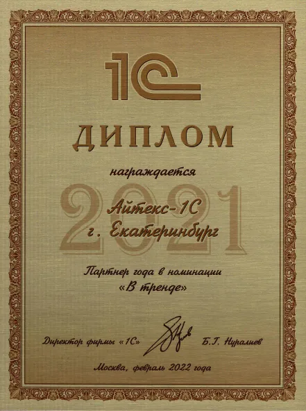 Наша компания стала партнером года в номинации "В тренде"! Тема номинации в 2021 году: «Сопровождение торговых решений 1С и маркировка». Победитель выбирался из партнеров с общим количеством договоров сопровождения не менее 100.