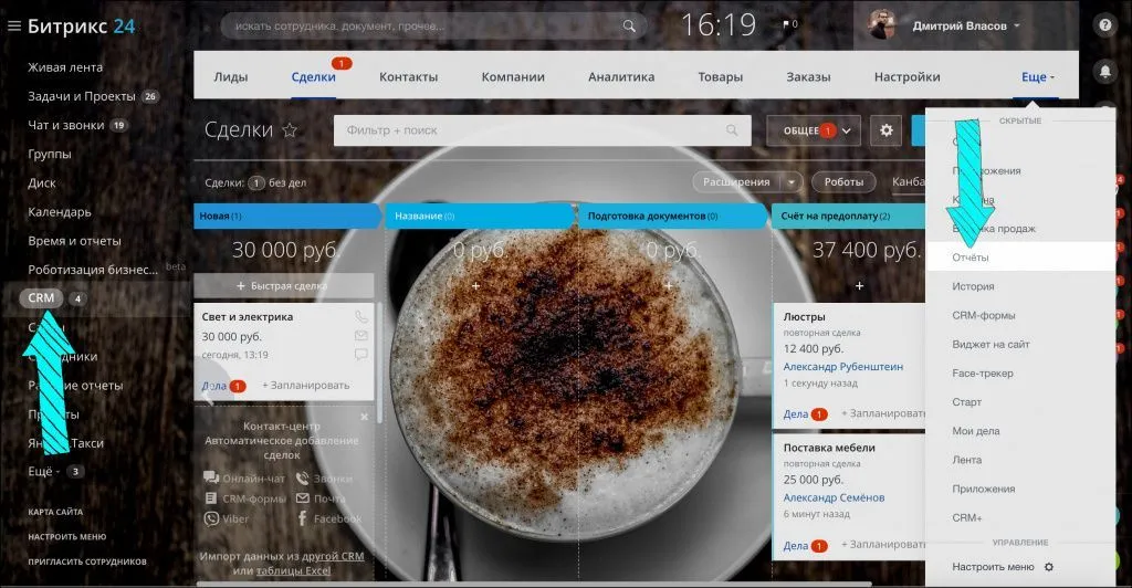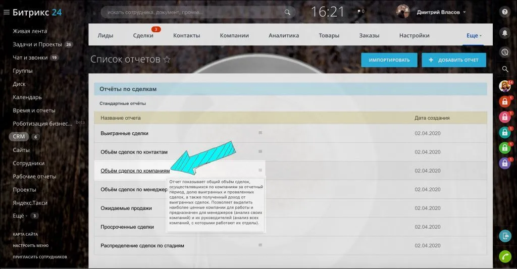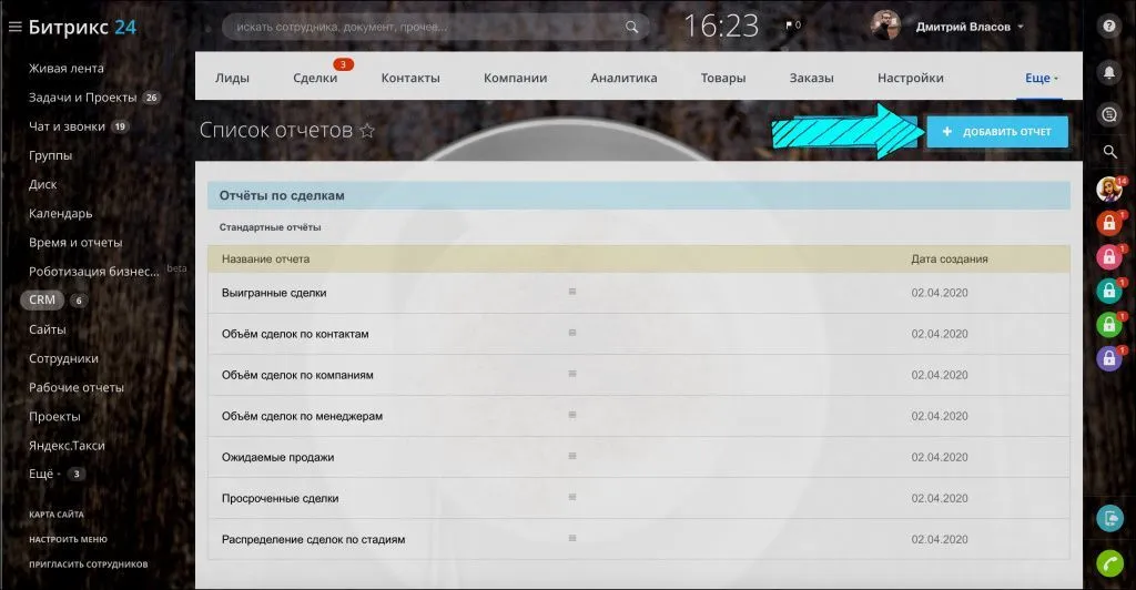 Перейдите в раздел CRM > Вкладка Ещё > Отчёты.