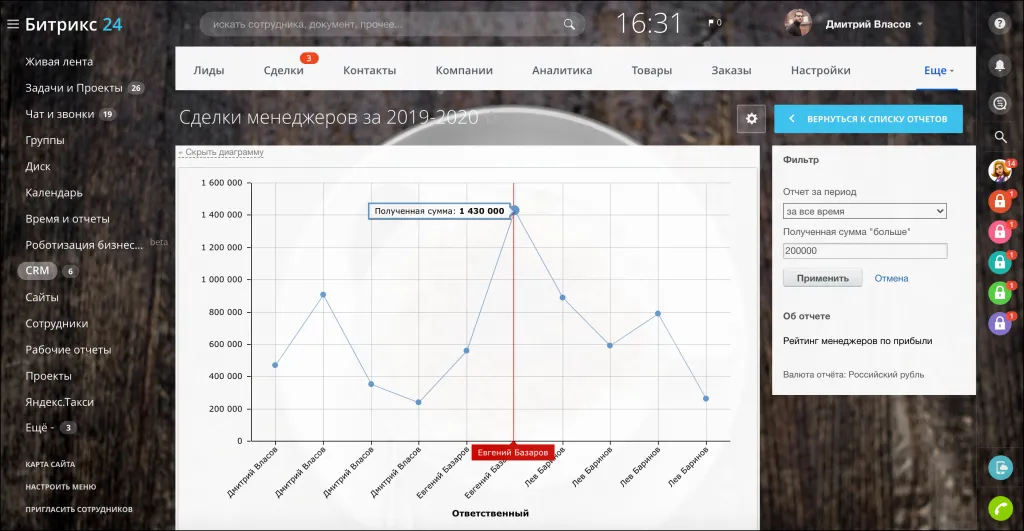 С помощью конструктора отчётов в CRM руководители могут оценить, как развивается компания, какую прибыль принесли менеджеры и какой товар подаётся успешнее всего.
