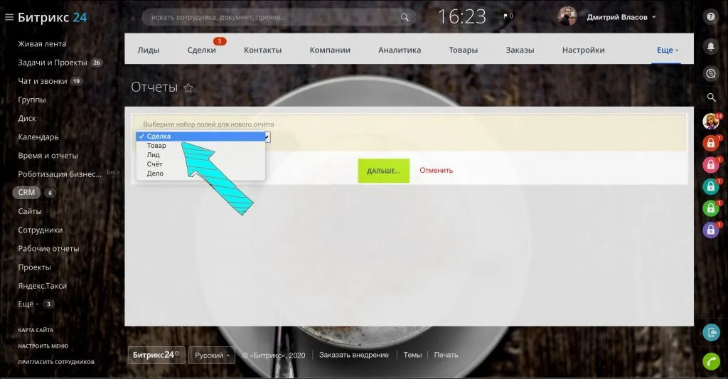Выберите набор полей для отчёта. В настоящее время отчёт можно построить для сделок, товаров, лидов, счетов и дел.