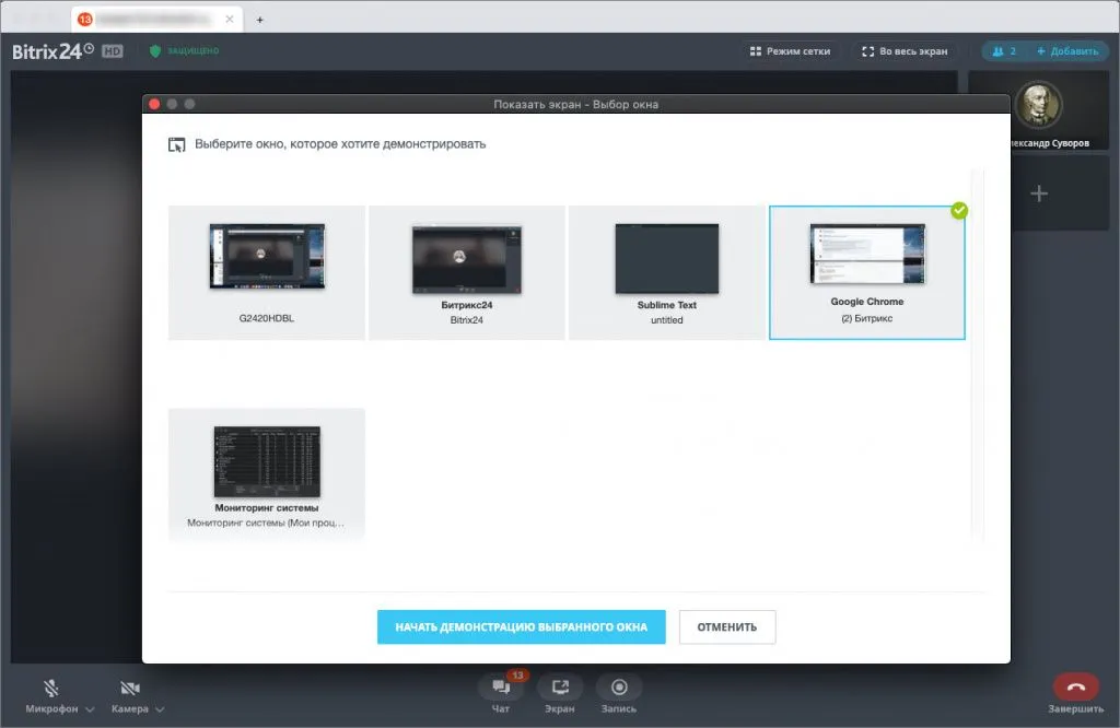 Вы можете для обсуждений делиться своим экраном. Теперь для демонстрации можно выбрать, какой экран монитора или окно программы показывать.