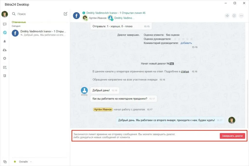 · Если оператор ответил, но клиент не отреагировал в течение 24 часов от своего последнего обращения, то возможность отправить сообщение у оператора также блокируется.