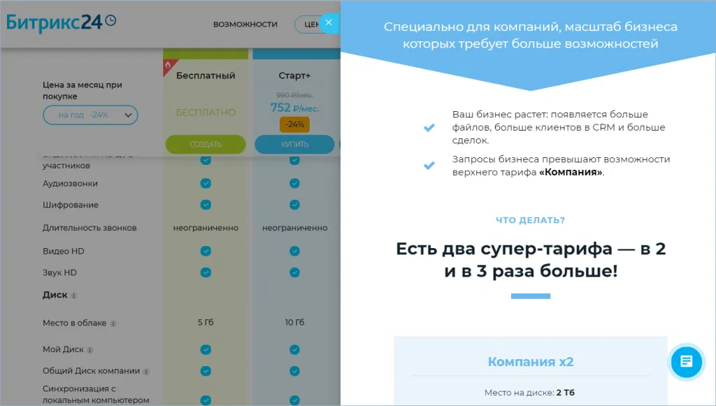 Для пользователей Битрикс24 есть отличная новость! Вы можете расширить возможности вашего бизнеса в 2 или в 3 раза благодаря новым супер-тарифам Компания х2 и Компания х3. Еще больше файлов и документов, больше клиентов и сделок.