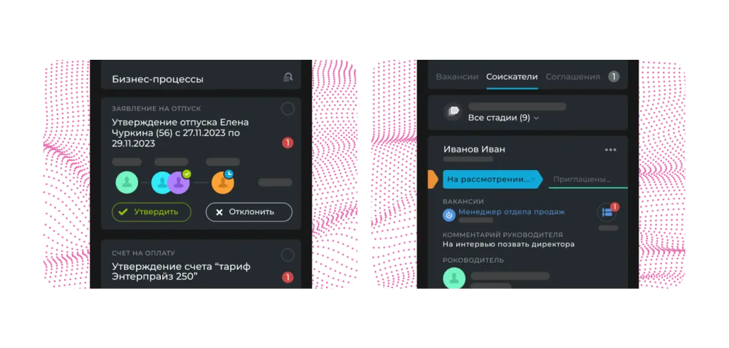 Новое мобильное приложение запускается моментально, переключает вкладки плавно и быстро. Можно заводить бизнес-процессы, настраивать сценарии работы, назначать встречи и многое другое. Полнофункциональное рабочее место — прямо на смартфоне: