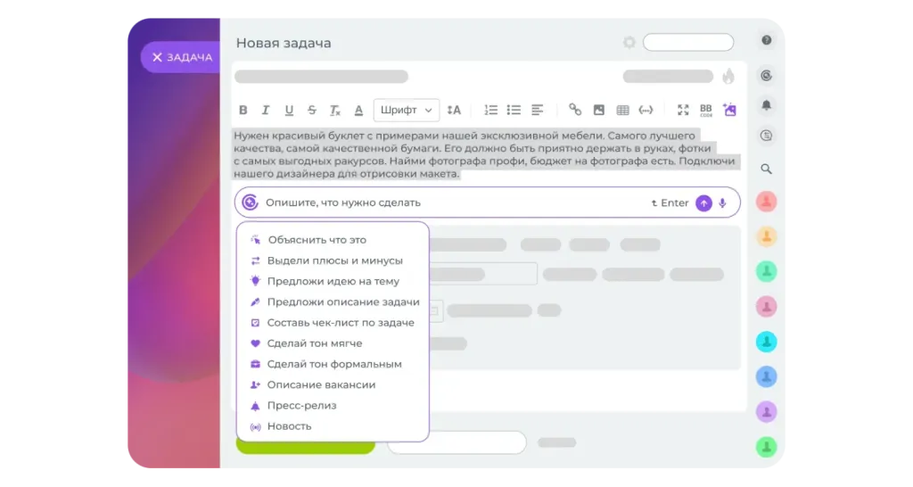 Просто скажите CoPilot, что нужно сделать, и получите результат за секунды. Обращайтесь к помощнику с вашими обычными задачами прямо в Битрикс24: