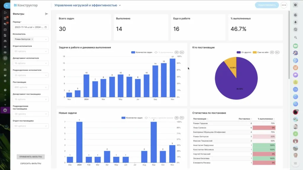 Отчеты по Задачам в BI-конструкторе наглядно показывают загруженность сотрудников и целых отделов и помогают руководителям управлять командой на основе данных.