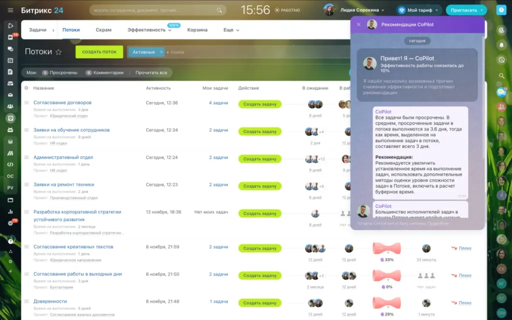 В новом релизе Битрикс24 к работе подключается CoPilot. AI-ассистент поможет выяснить причины снижения эффективности Потока и предложит пути для улучшения данной ситуации.