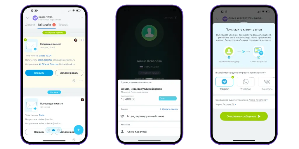 Обрабатывайте звонки и письма, даже если не у компьютера. Вся история сохраняется в Битрикс24.