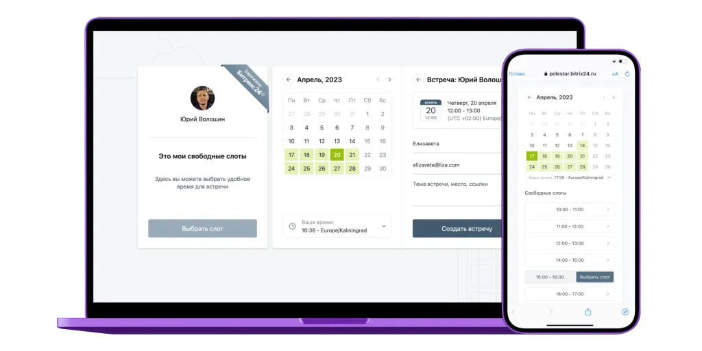 Больше не нужно присылать свободное время и искать пересечения с каждым участником. Просто отправьте ссылку на ваши свободные слоты по SMS, e-mail или в мессенджер. Событие сохранится в календаре внутри CRM.