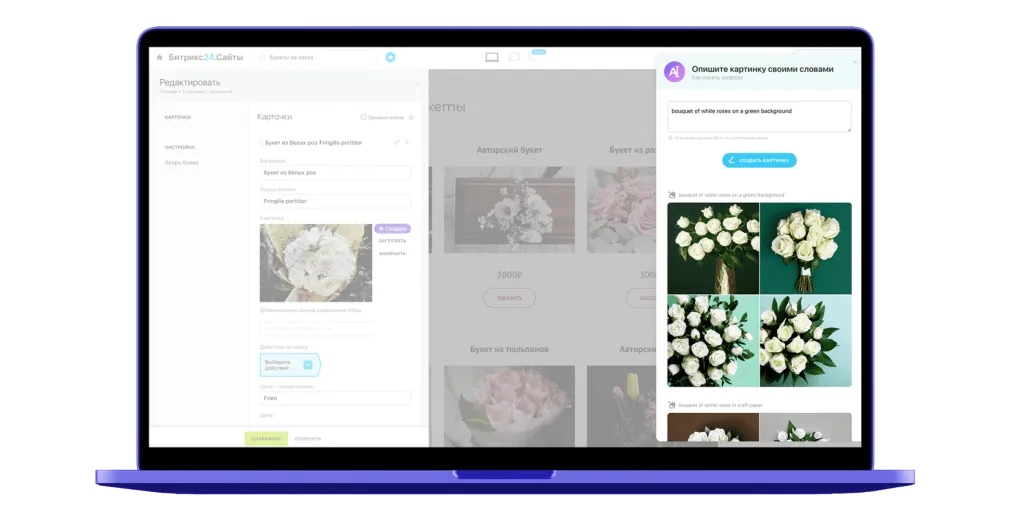 Создавайте продающие лендинги в Битрикс24 ещё быстрее. Больше не нужно искать картинки под каждый блок и задумываться, можно ли их использовать. Просто напишите, что вам нужно, и AI мгновенно нарисует красочное изображение по вашему описанию.
