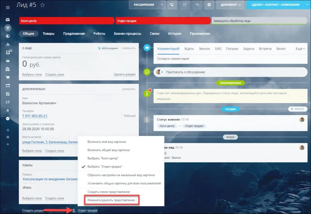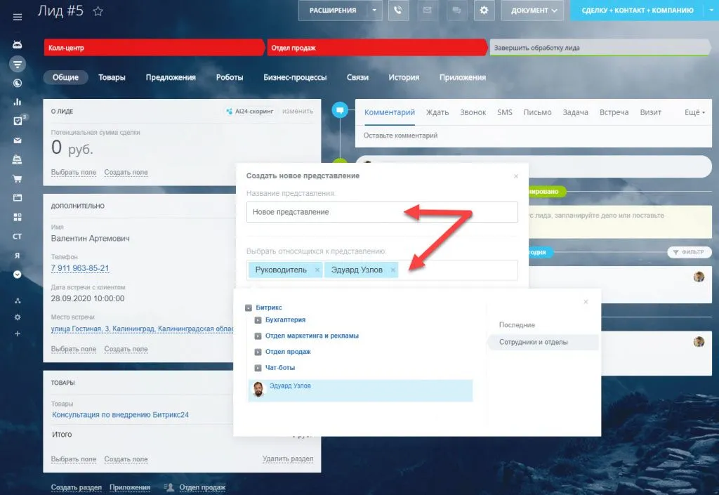 При подобных сценариях представления упростят работу сотрудников, покажут, какую информацию в карточке нужно заполнить.