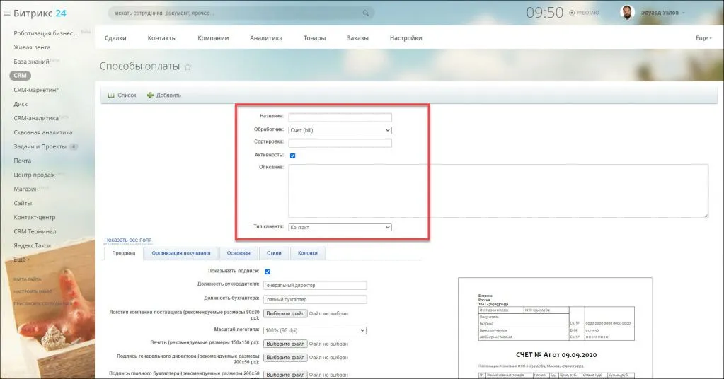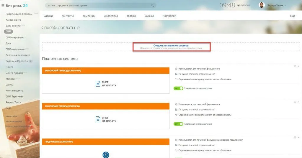 · Перейдите в раздел CRM - Настройки - Способы оплаты и нажмите кнопку Создать платежную систему: