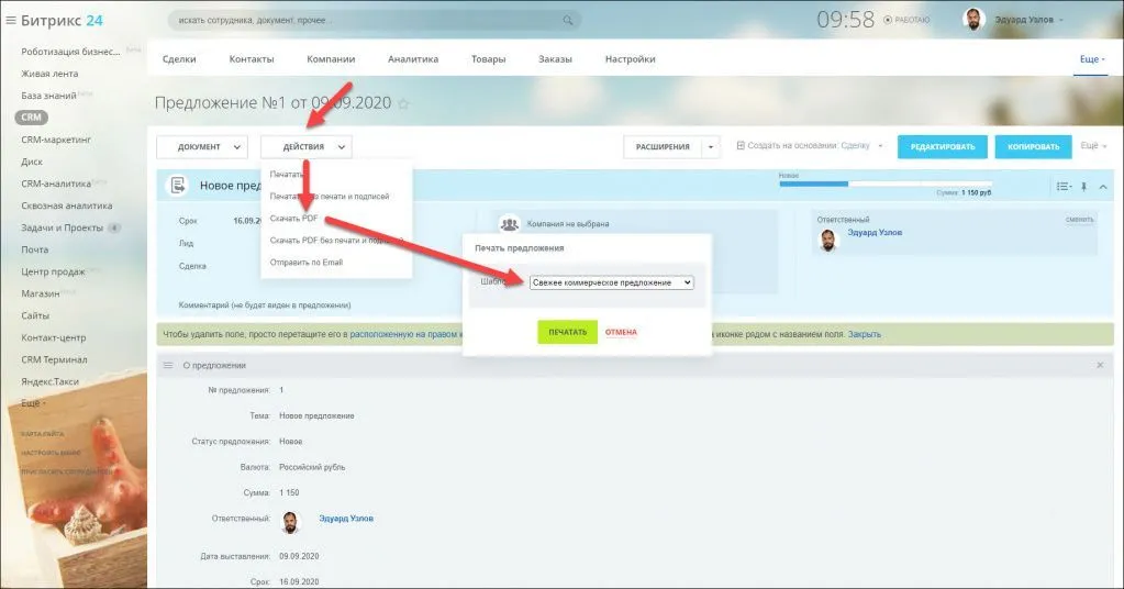Шаблон коммерческого предложения выбирается на этапе отправки/печати: