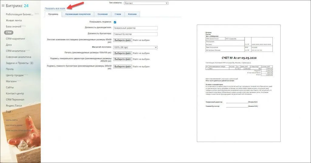 С Битрикс24 вы можете гибко настроить шаблоны счетов и предложений. Вы выбираете нужный тип документа, а система автоматически формирует его и заполняет данными.