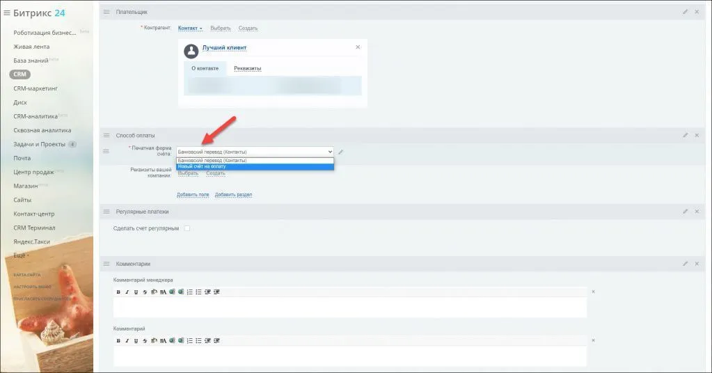 Теперь при создании счёта вы можете выбрать этот шаблон в блоке Способ оплаты: