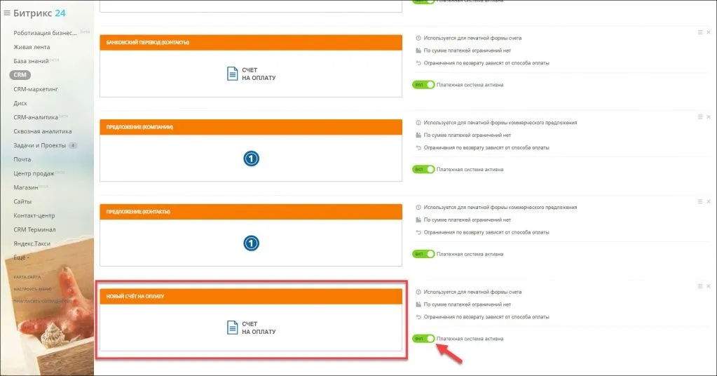 После сохранения новый шаблон появится в списке способов оплаты. Убедитесь, что платежная система активна.