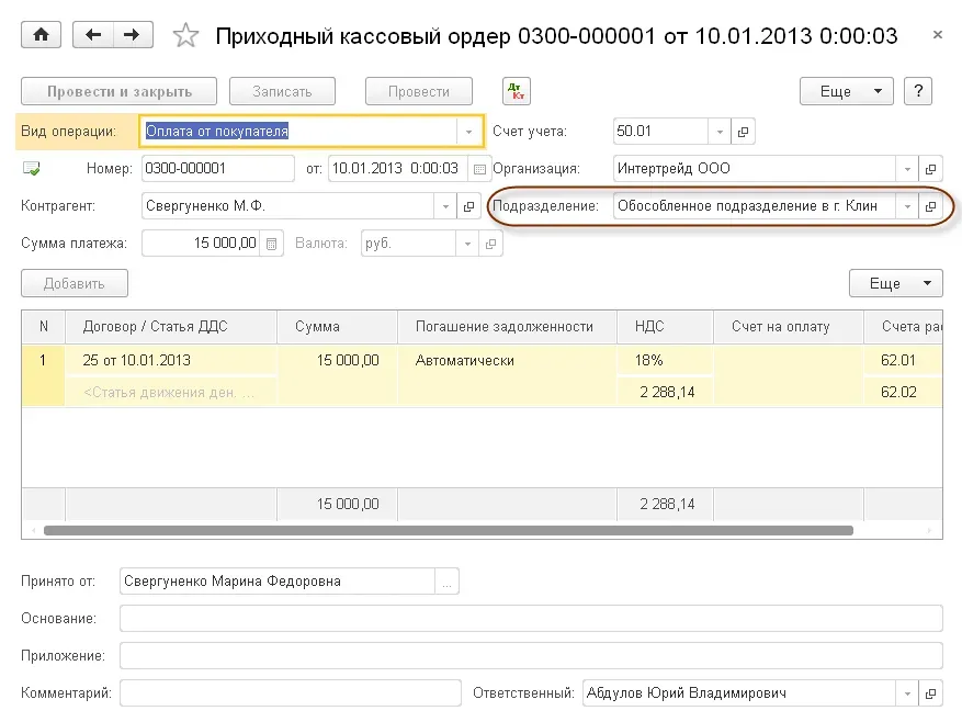 Для каждого обособленного подразделения можно указать адреса, телефоны, фамилии ответственных лиц подразделения. Эти данные отображаются в печатных формах всех документов, выписанных обособленным подразделением. Поддерживается раздельная нумерация документов по обособленным подразделениям.