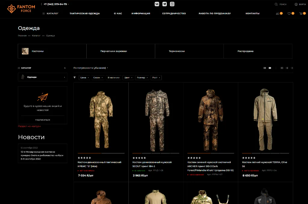 Компания клиента - молодая, динамично развивающаяся компания, которая производит одежду и экипировку для любителей активного отдыха, охоты и рыбалки под ТМ FANTOM FORCЕ.